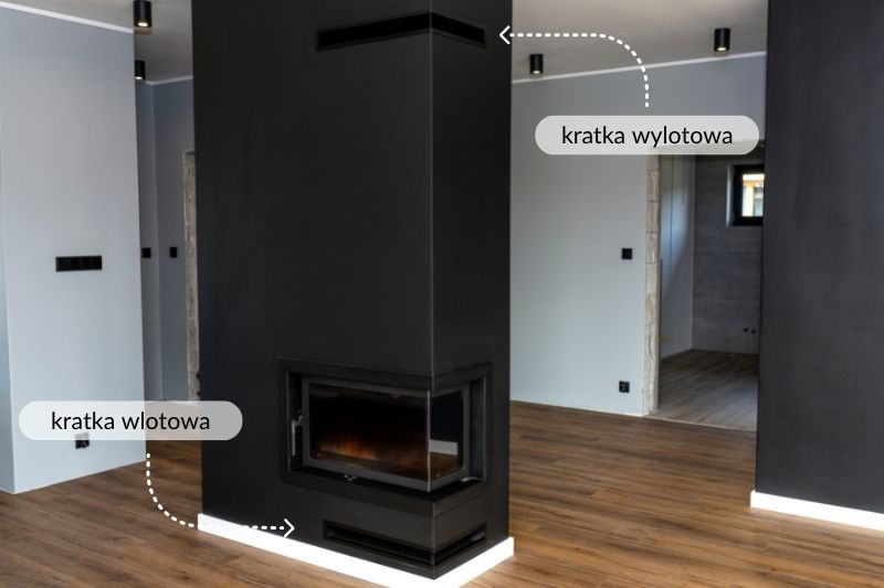 Standardowo w obudowie kominka muszą być zamontowane co najmniej trzy kratki. Jedna z nich (ta największa) znajduje się zazwyczaj w górnej części obudowy i stanowi kluczowy element systemu dystrybucji gorącego powietrza (DGP). Jej podstawową funkcją jest odprowadzanie nagrzanego powietrza z kominka do pomieszczenia. Za jej pośrednictwem ciepłe powietrze wytwarzane w kominku może wydostać się na zewnątrz, czego rezultatem jest podwyższenie temperatury otoczenia. Kolejna kratka powinna być zamontowana w dolnej części obudowy, poniżej komory spalania kominka. Jej zadaniem jest zaciąganie powietrza z pomieszczenia do obudowy.