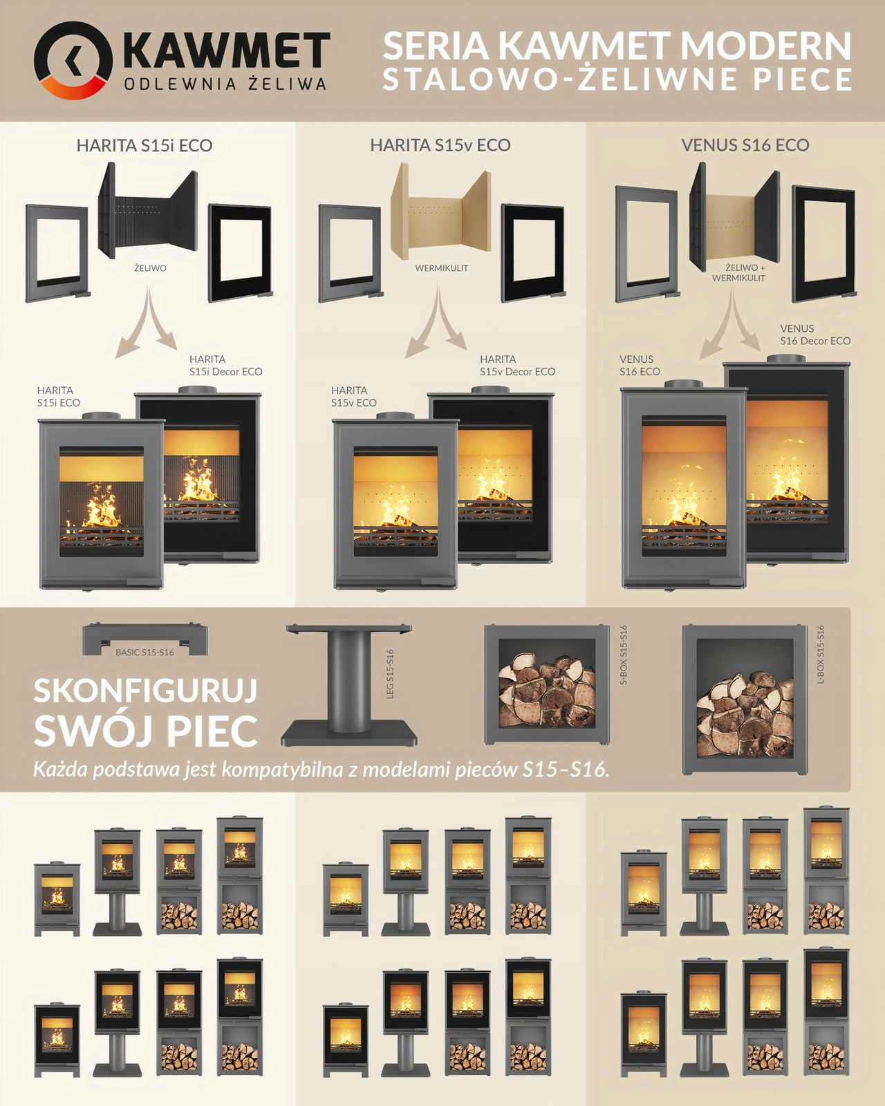 Piece kominkowe Kawmet Harita to nowoczesne kozy wolnostojące na drewno, spełniające wymagania Ecodesign i przeznaczone do efektywnego dogrzewania domów jednorodzinnych oraz mieszkań. Seria obejmuje zarówno wersje z paleniskiem żeliwnym (S15i), jak i wyłożonym wermikulitem (S15v), dostępne na różnych podstawach: Basic, Leg, S‑BOX i L‑BOX, także w wariantach Decor.