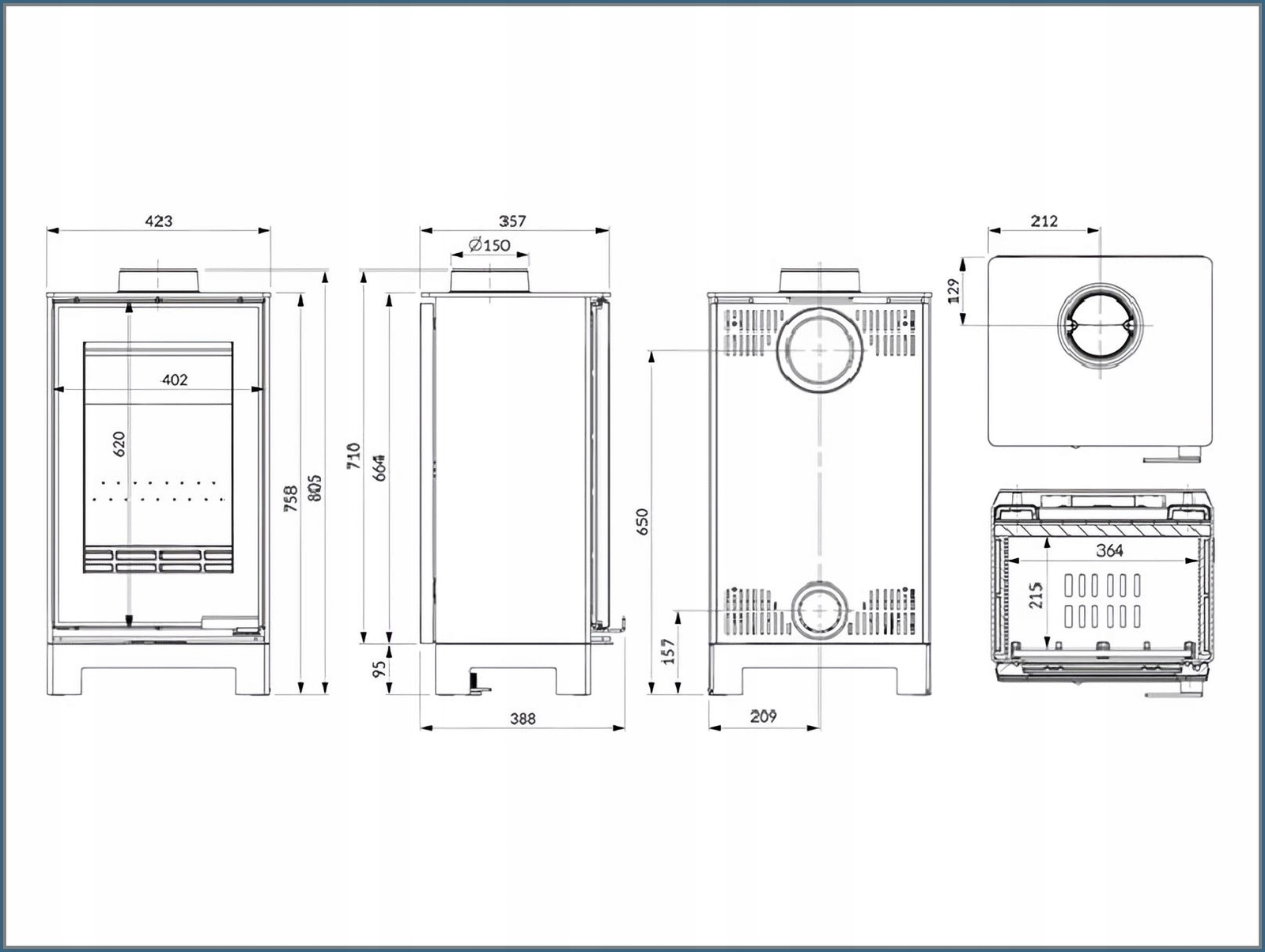 Korpus pieca wykonano ze stali dla szybkiego nagrzewania i oszczędności paliwa, a kluczowe elementy jak drzwiczki, ruszt i płotek z wysokiej jakości żeliwa dla trwałości. Wyposażony w żaroodporne szkło Robax® (do 800°C) zapewniające widok na ogień, średnica przewodu kominowego wynosi 150 mm, a średnia temperatura spalin to 236,6°C. Waga modelu to około 114 kg, wymiary: 423 x 810 x 388 mm.