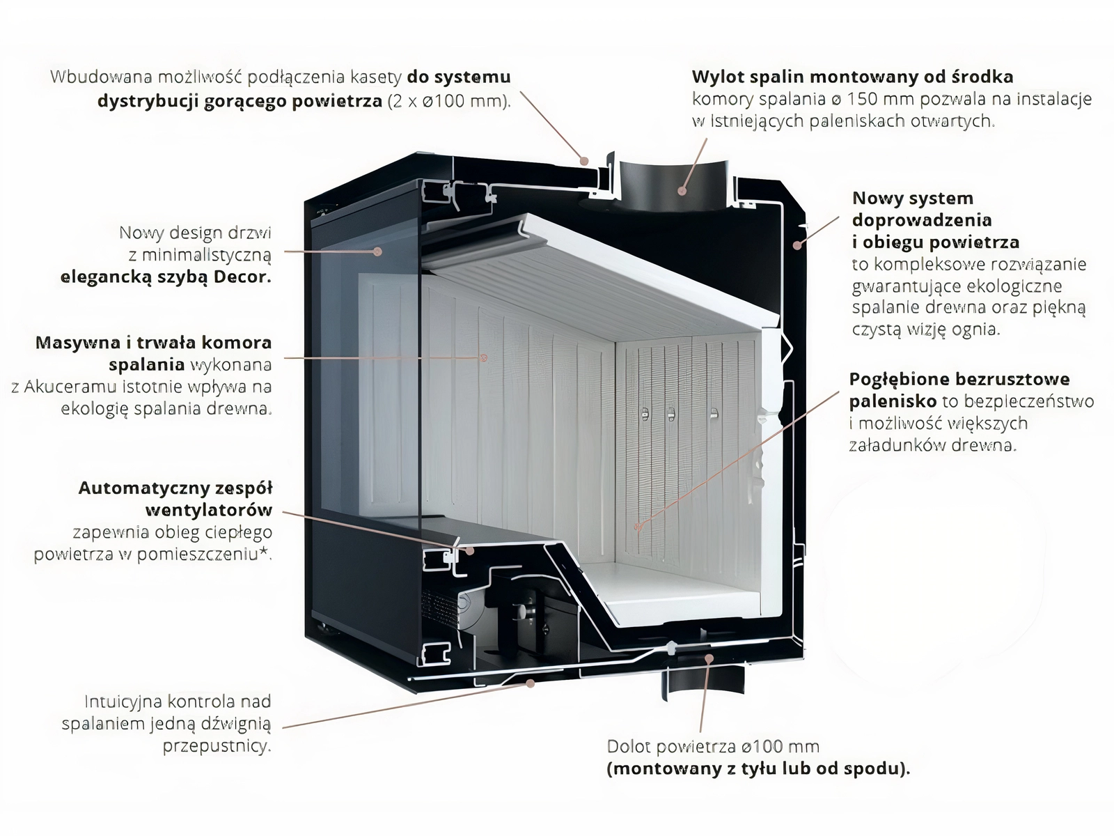 - Nowoczesny system spalania – precyzyjny dopływ powietrza zapewnia czyste, ekologiczne i wydajne spalanie drewna.