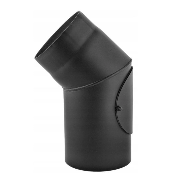 Kolano spalinowe czarne stałe z rewizją o średnicy 150 mm rozwarte pod kątem 45 stopni należy do rodziny elementów systemu przyłączy czarnych SPK.