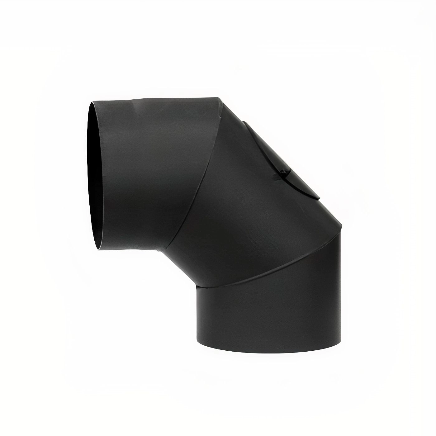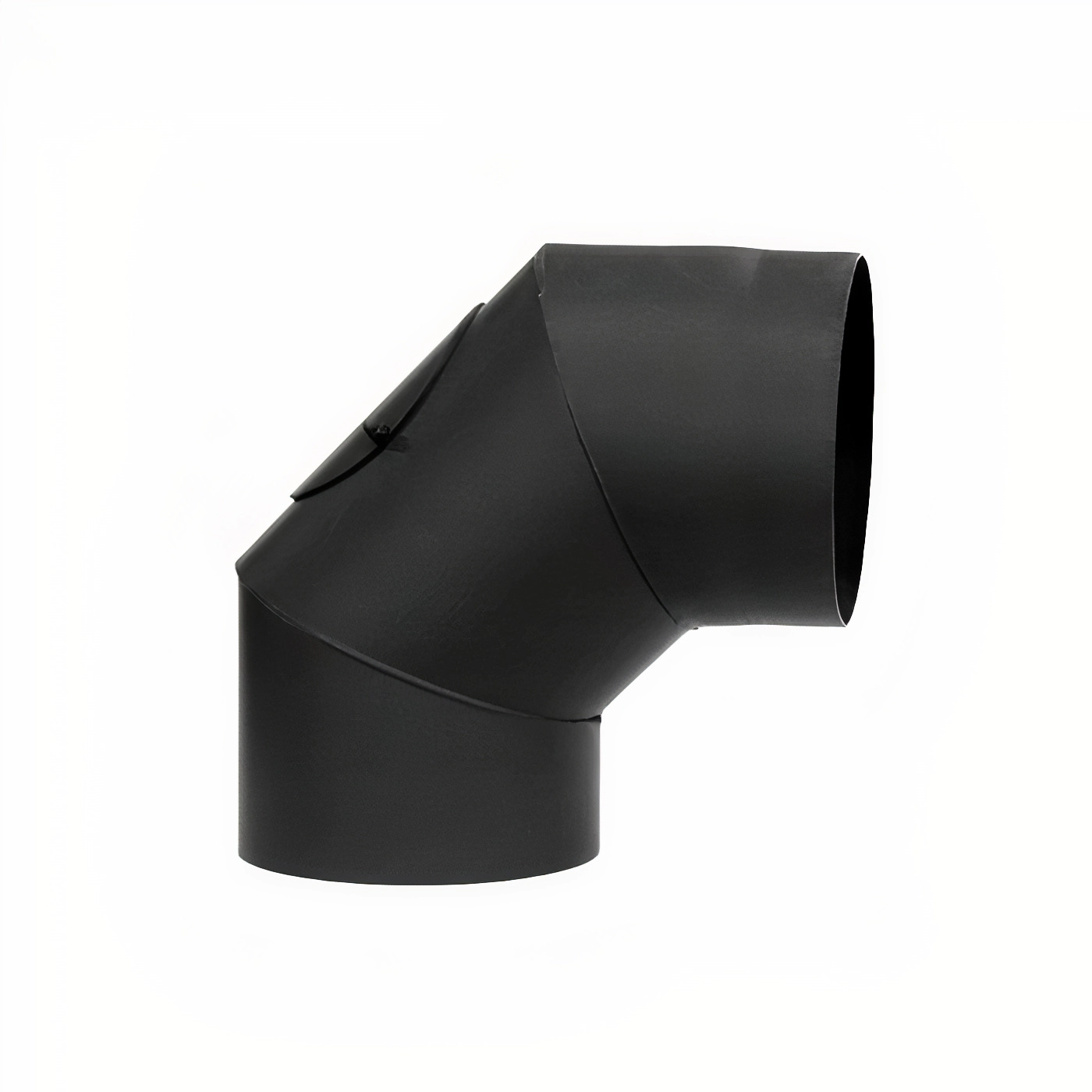 Kolano spalinowe czarne stałe z rewizją o średnicy 180 mm rozwarte pod kątem 90 stopni należy do rodziny elementów systemu przyłączy czarnych SPK.