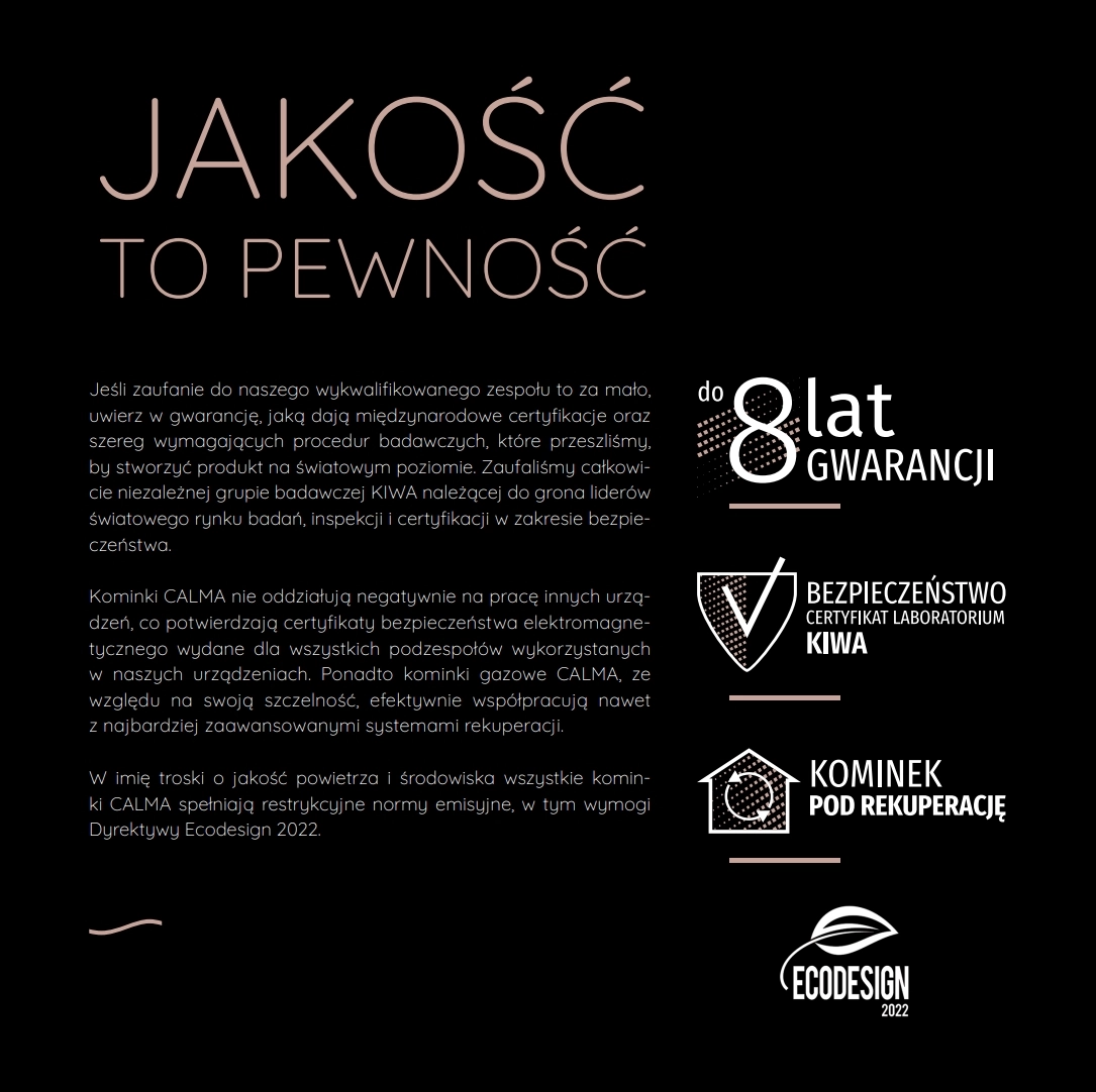 Nie stawiaj sobie żadnych ograniczeń przy tworzeniu wymarzonej strefy wypoczynku. Odkrywaj nowe inspiracje, twórz niepowtarzalne aranżacje. My zapewniamy najlepsze technologie, oparte na solidnych materiałach konstrukcyjnych. Cała automatyka gazowa w kominkach CALMA jest identyczna z tą, którą znajdziesz w najbardziej renomowanych holenderskich markach. Międzynarodowe certyfikaty oraz liczne, rygorystyczne procedury testowe, przez które przeszliśmy, gwarantują, że nasze kominki są niezawodne. Dla dobra środowiska naturalnego wszystkie modele CALMA spełniają surowe wymagania Dyrektywy Ecodesign 2022, dbając o jakość powietrza w Twoim domu.
