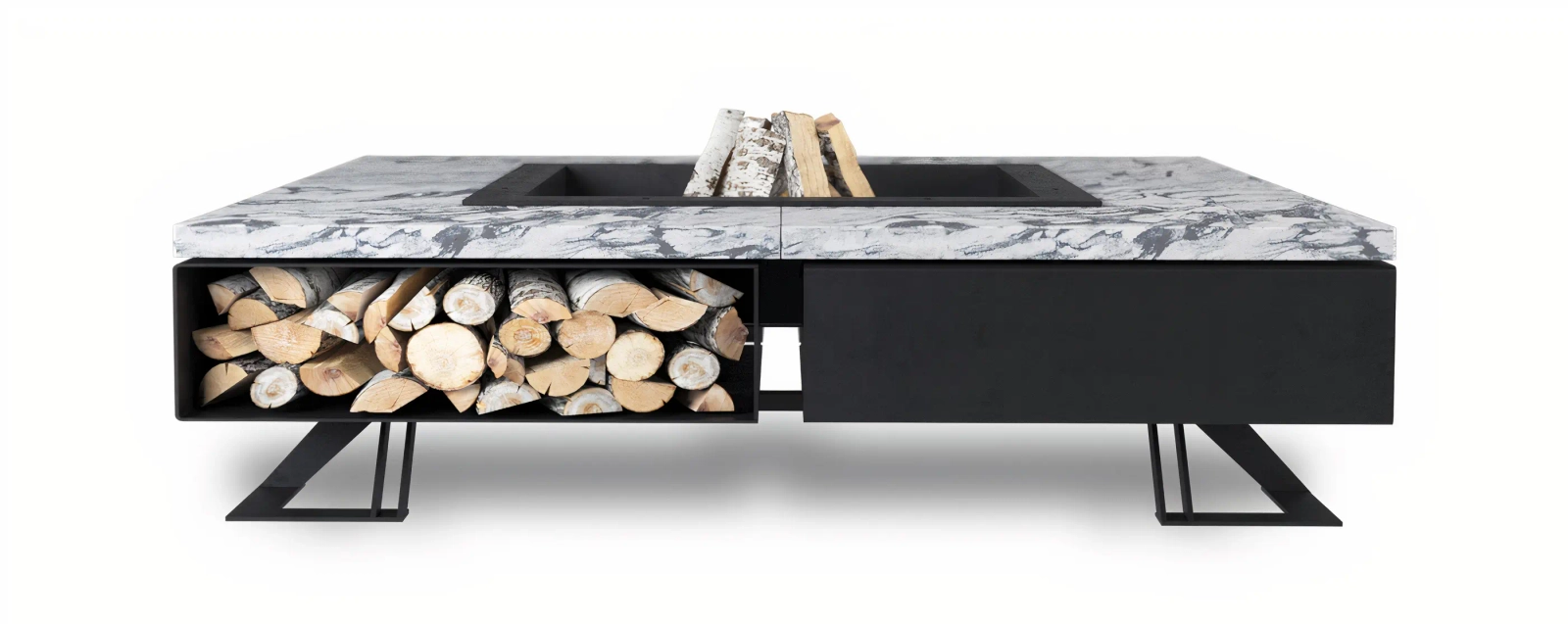 Uniwersalny kwadratowy kształt paleniska komponuje się idealnie z nowoczesną architekturą.