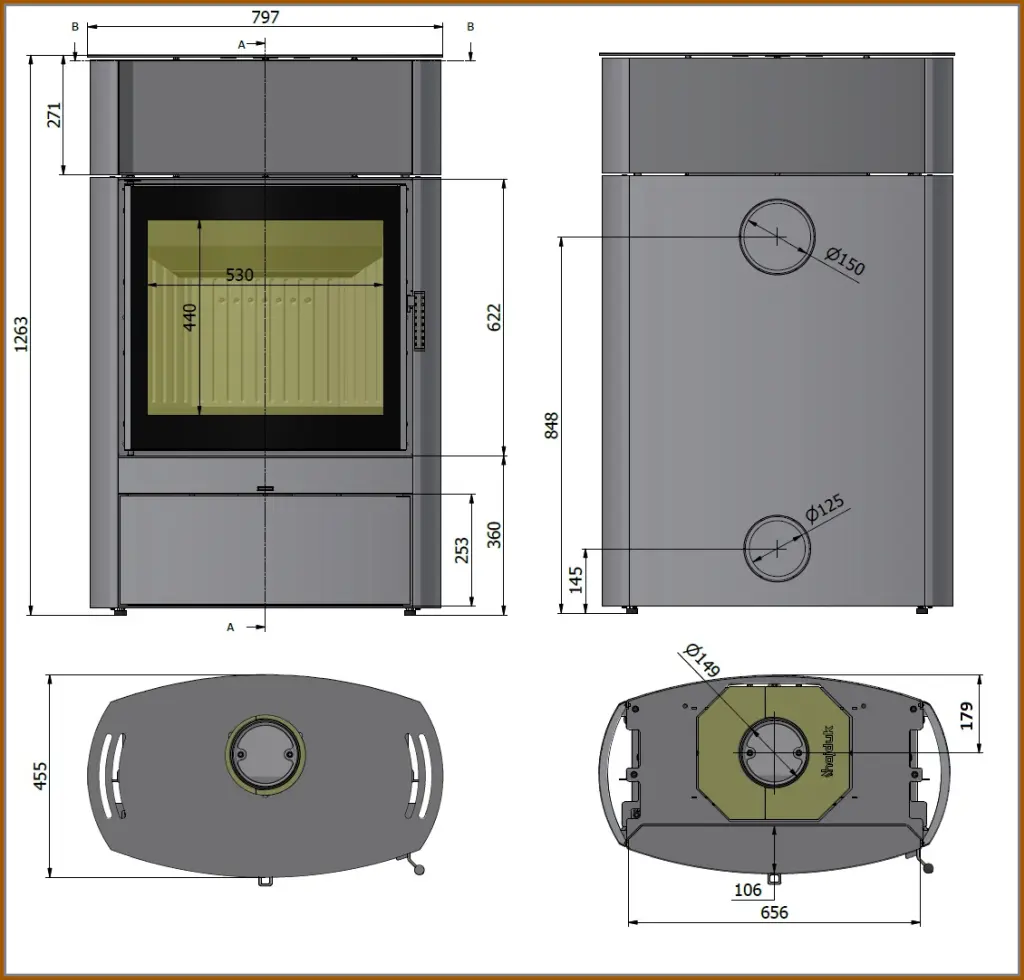 W standardzie znajduje się nasada z modułami akumulacyjnymi o wysokiej gęstości (~3000 kg/m³), co pozwala na magazynowanie ciepła i jego stopniowe uwalnianie nawet po wygaszeniu paleniska. Dzięki temu użytkownicy mogą cieszyć się przytulną atmosferą przez wiele godzin. Piec posiada zamkniętą komorę spalania wyłożoną ceramiką akumulacyjną, ruszt żeliwny, popielnik oraz doprowadzenie powietrza z zewnątrz Ø125 mm — co czyni model odpowiednim także do domów z wentylacją mechaniczną lub rekuperacją. Wylot spalin Ø150 mm umożliwia elastyczne rozwiązania instalacyjne.