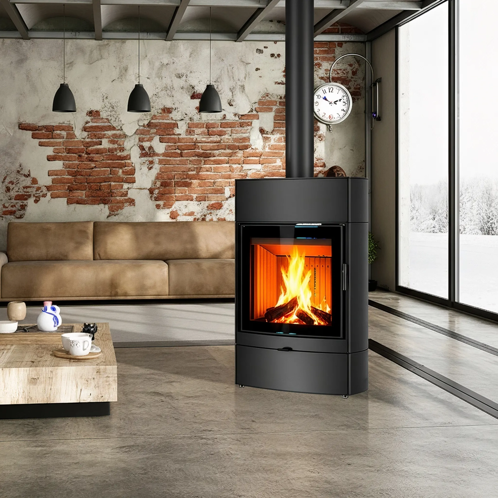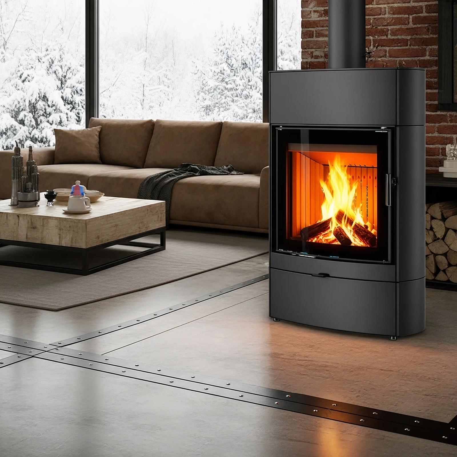 Hajduk ELIPSE F3A to elegancki piec wolnostojący wyposażony w zestaw akumulacji ciepła, zaprojektowany do długotrwałego oddawania komfortowego ciepła. Urządzenie wyróżnia się dużą łukową szybą panoramiczną, która tworzy efektowną wizję ognia – idealnie wpisując się w nowoczesne wnętrza. W standardzie piec jest wyposażony w zamkniętą nasadę do mocowania modułów akumulacyjnych.