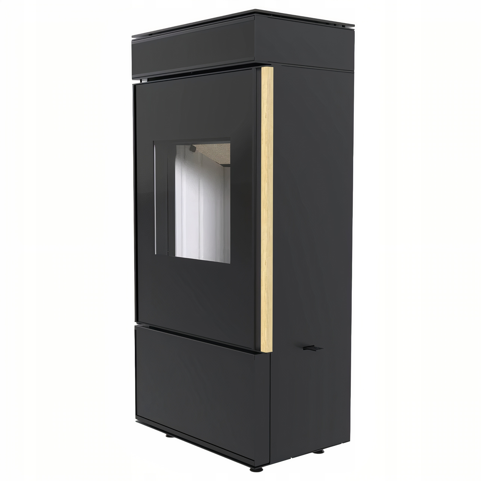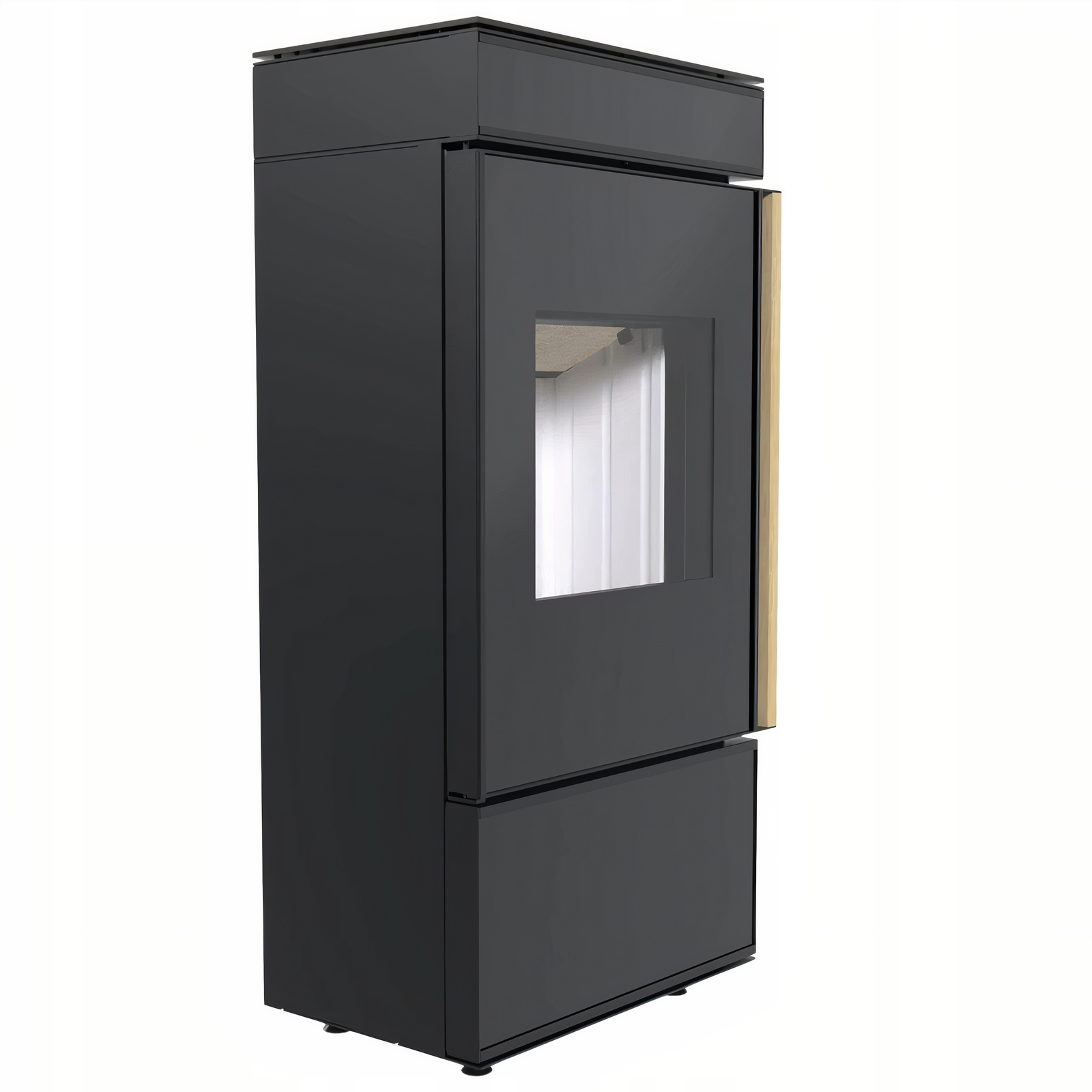 ✅ Charakterystyczny wygląd piecyka podkreślają eleganckie detale – ciemny lacobel w połączeniu z drewnianą klamką tworzą harmonijną kompozycję industrialnego stylu. Pionowa drewniana klamka nie tylko pełni funkcję estetyczną, ale także ułatwia szczelne zamknięcie drzwiczek za pomocą precyzyjnego zatrzasku.