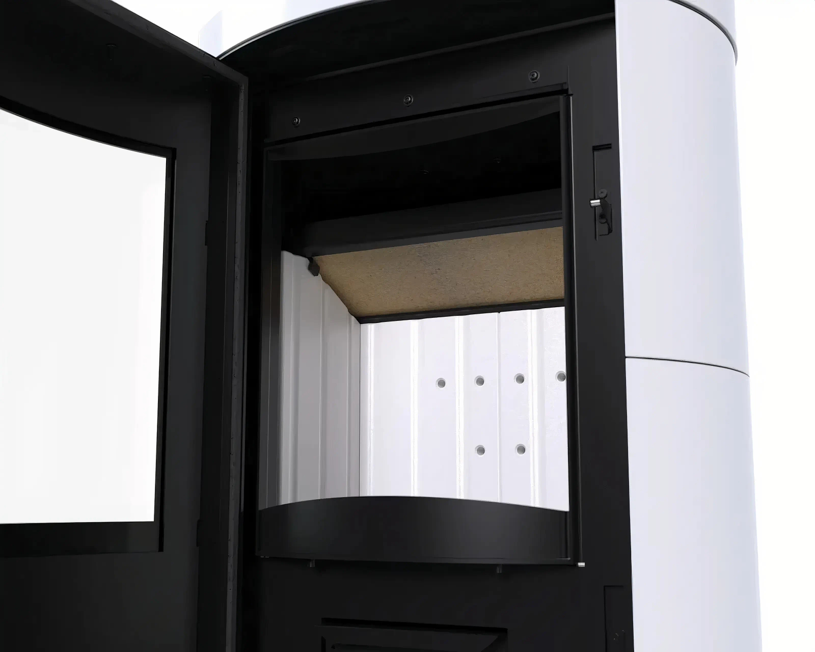 ✔️ Maksymalna długość polan wynosi 400 mm. Drewniana klamka z zatrzaskiem ułatwia szczelne zamknięcie drzwiczek i codzienną obsługę. Zaleca się używanie suchego drewna o wilgotności nieprzekraczającej 20%.
