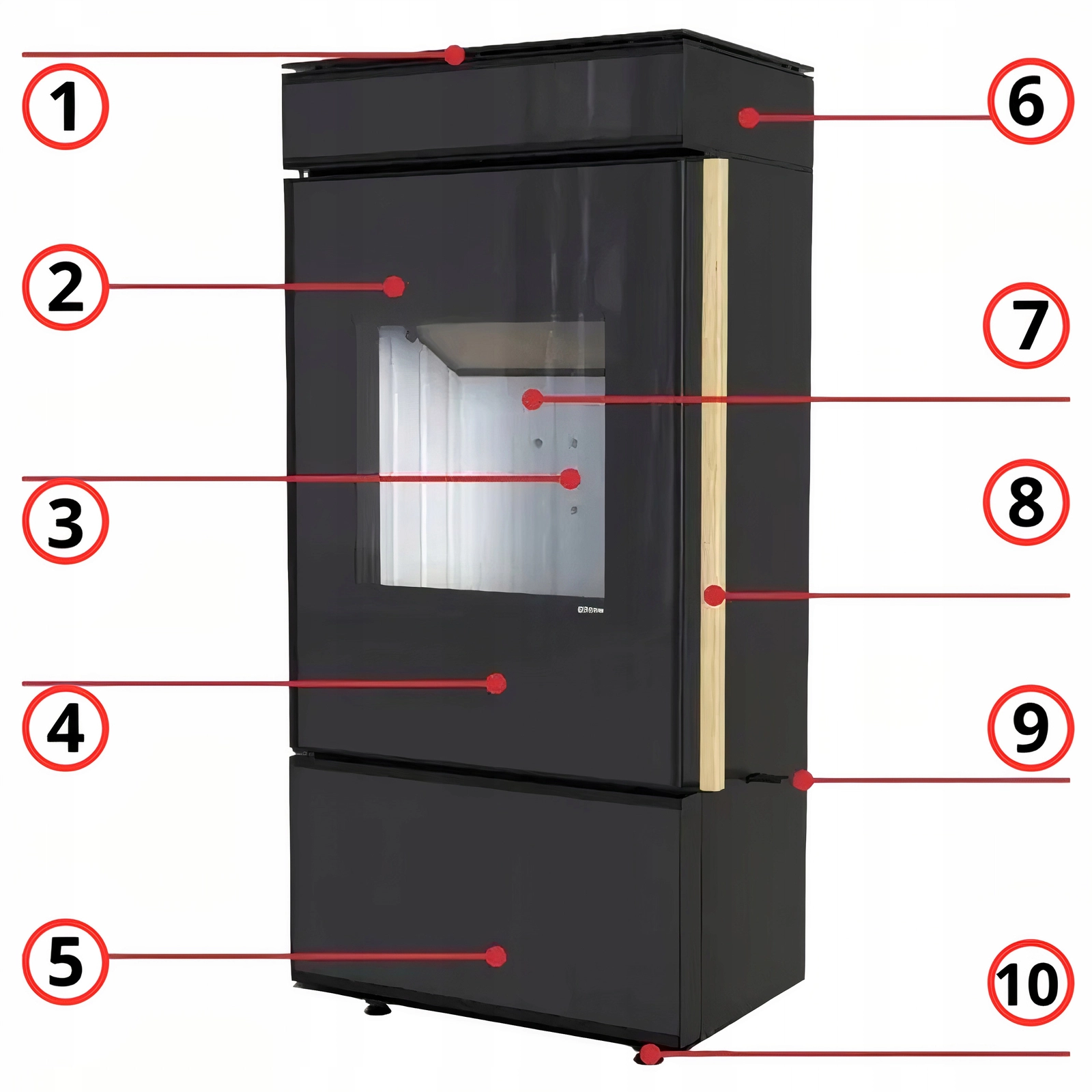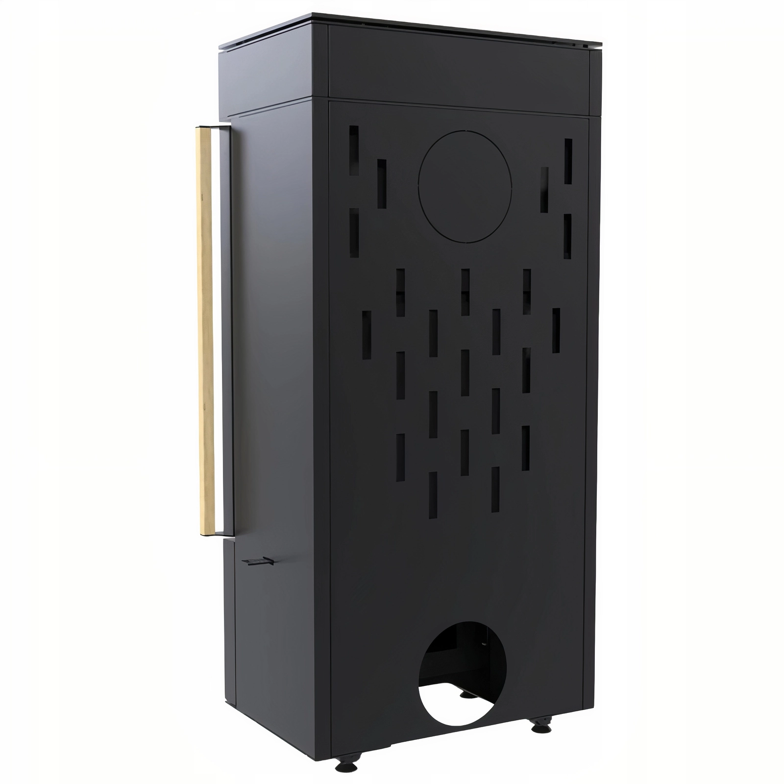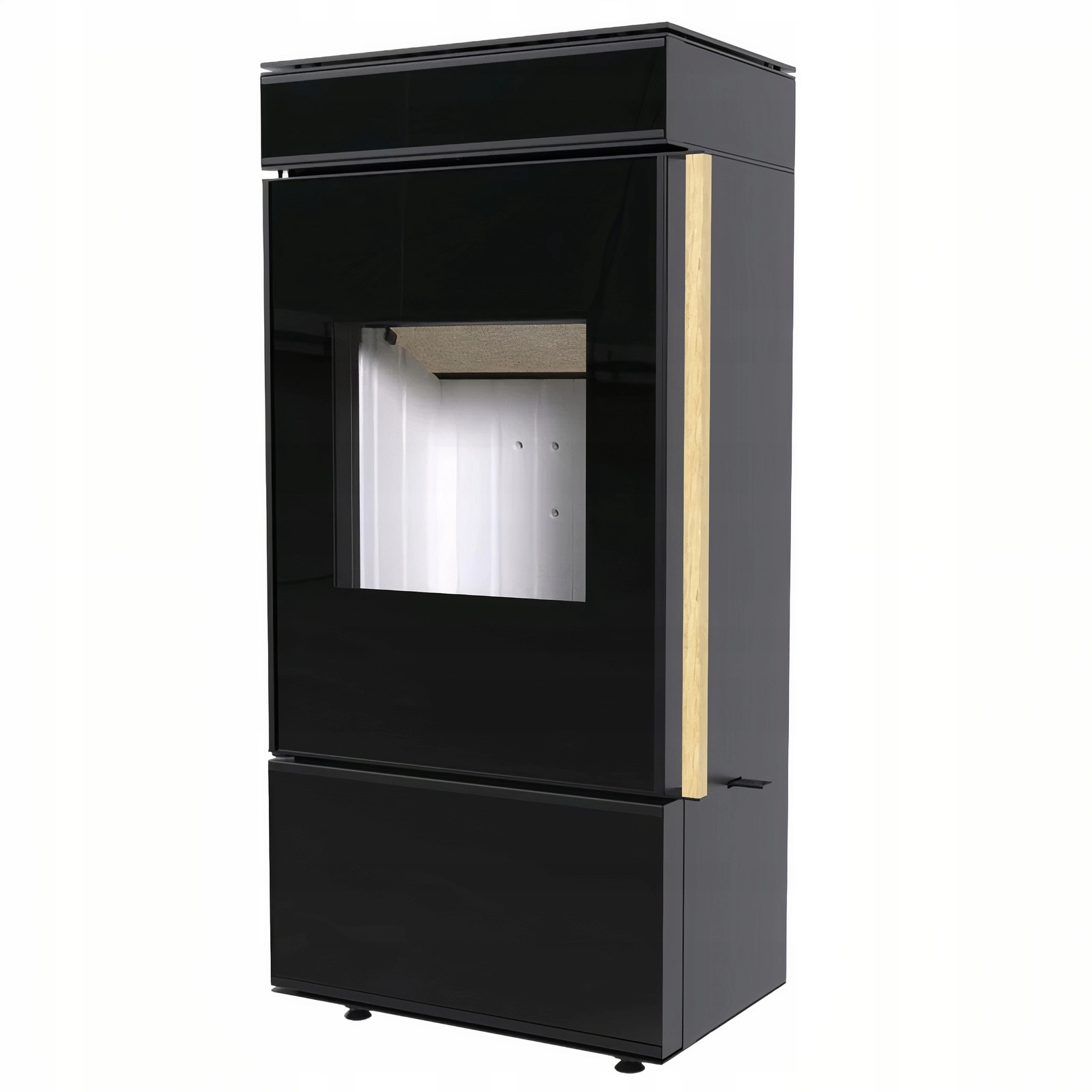 ✅ Charakterystyczny wygląd piecyka podkreślają eleganckie detale – ciemny lacobel w połączeniu z drewnianą klamką tworzą harmonijną kompozycję industrialnego stylu. Pionowa drewniana klamka nie tylko pełni funkcję estetyczną, ale także ułatwia szczelne zamknięcie drzwiczek za pomocą precyzyjnego zatrzasku.