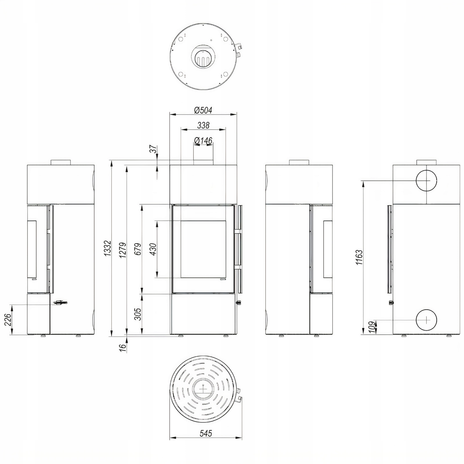 1. Wyjście spalin - możliwość podpięcia górnego fi 146 mm