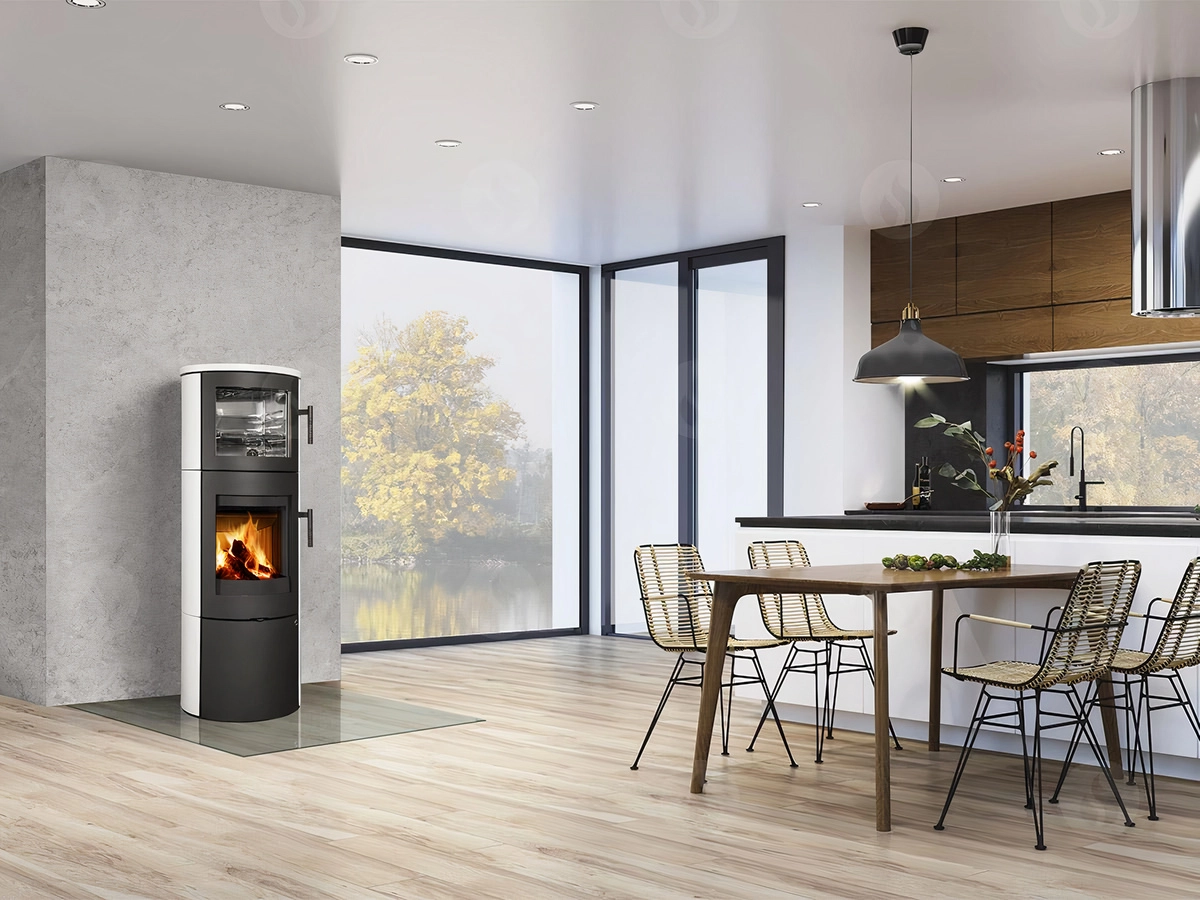 Dopływ powietrza wtórnego, które opływa szybę drzwiczek, zapobiega osadzaniu się zabrudzeń na szybie. Komorę spalania wyłożono szamotem.