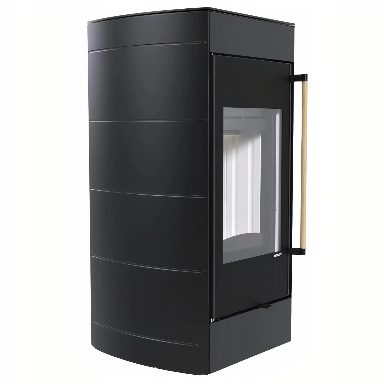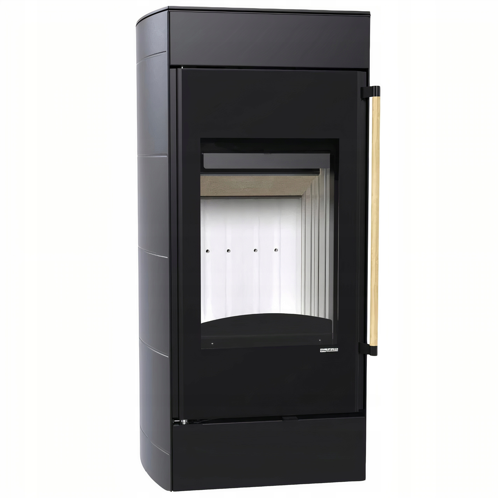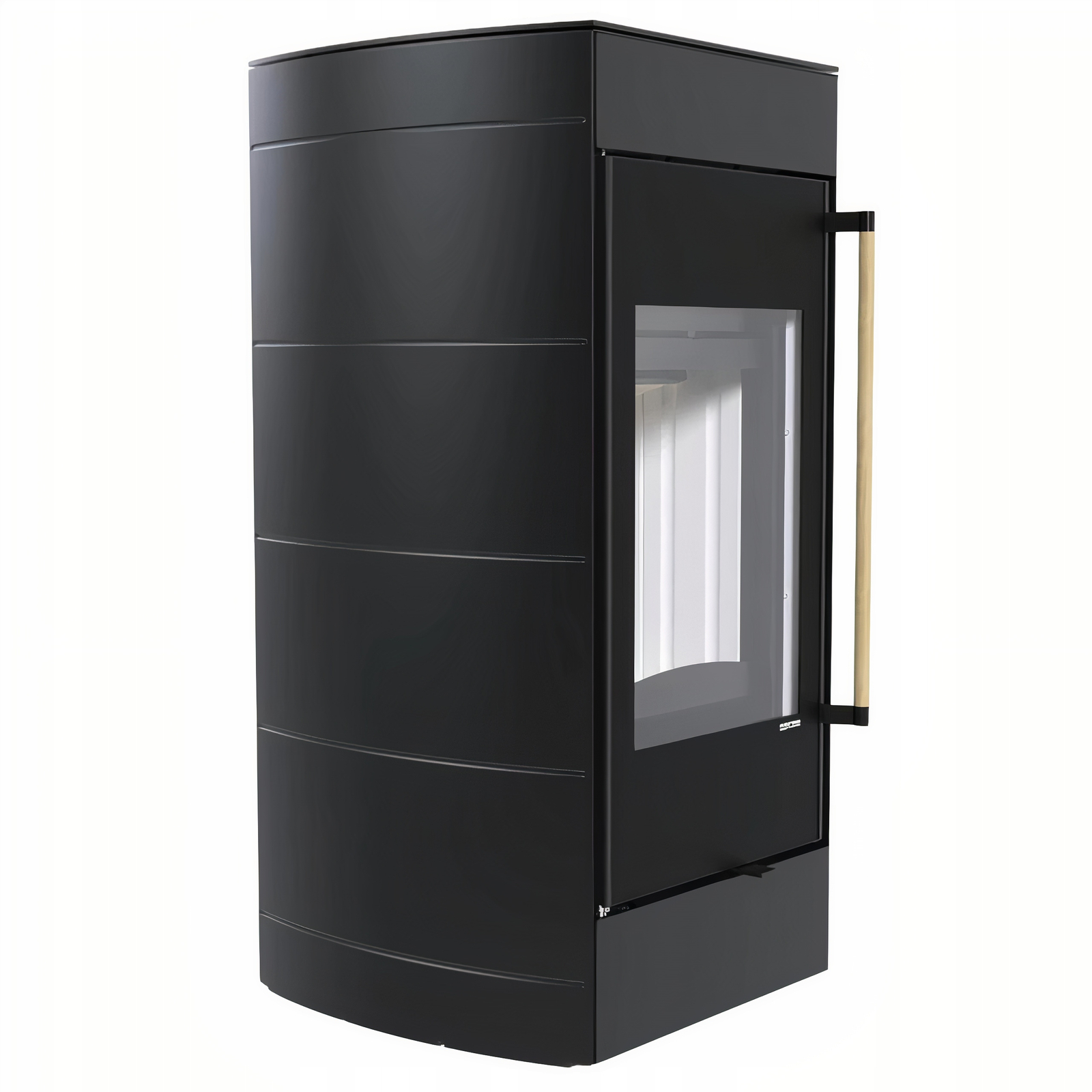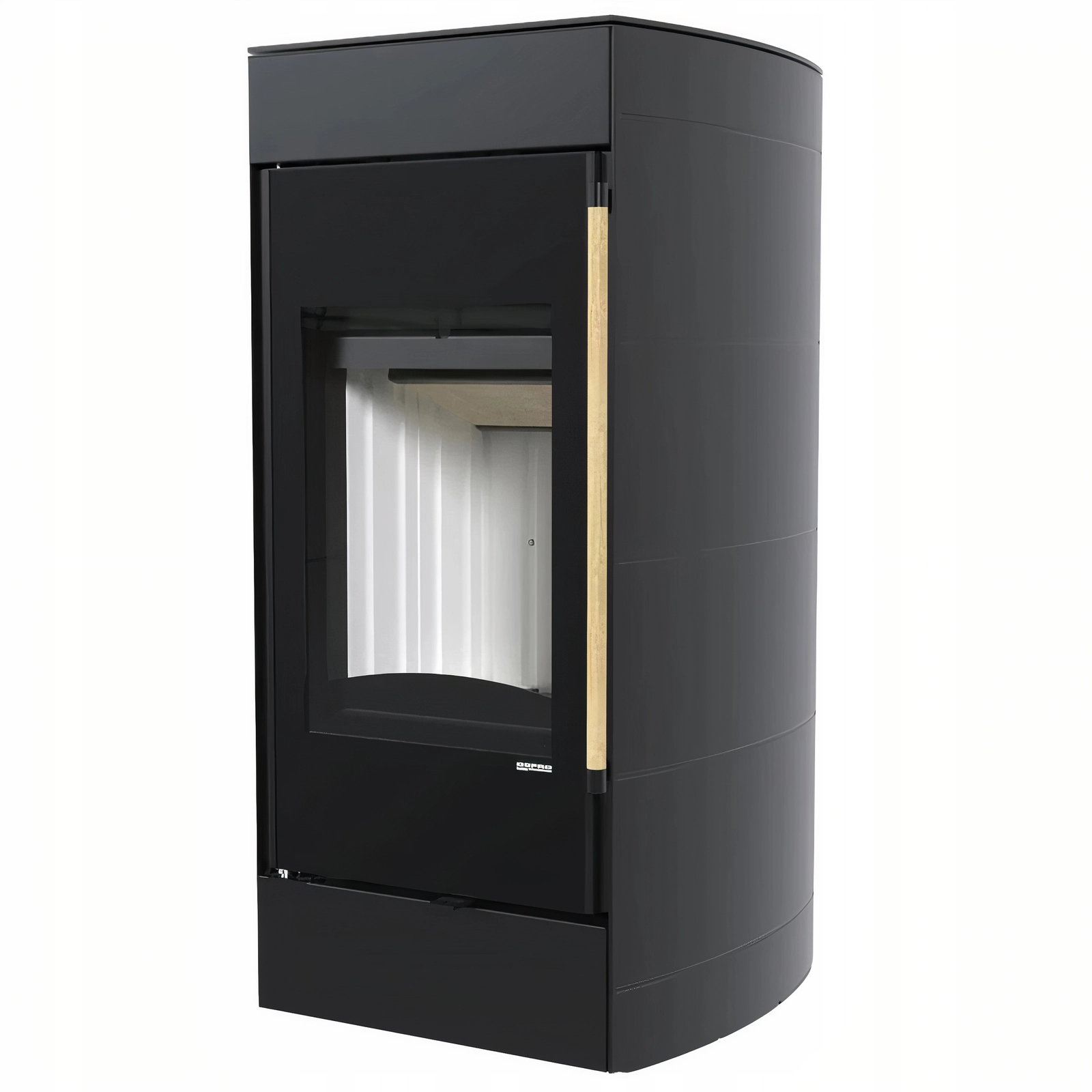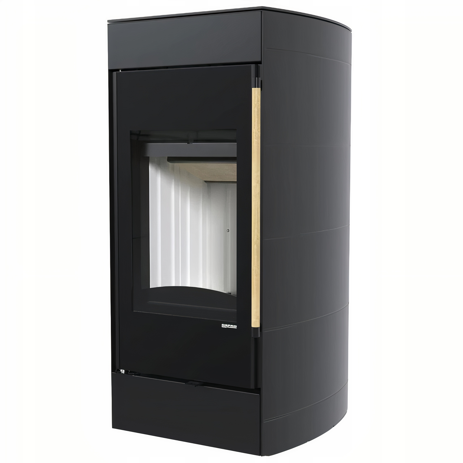 ✅ Piecyk został wyposażony w standardzie w podwójną szybę z opcją zamówienia szyby potrójnej, co zapewnia doskonałą izolację termiczną i spektakularny widok na płomienie. Nowoczesne zamykanie oparte na zatrzasku oraz drewniany uchwyt drzwi (z opcją czarnego uchwytu) podkreślają elegancki design urządzenia.