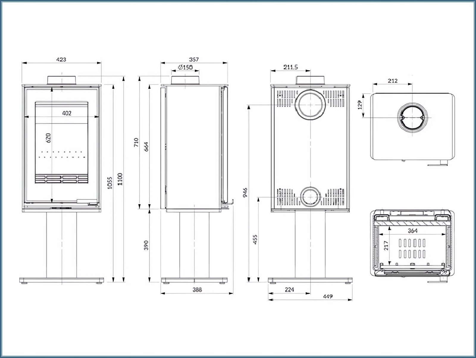 Korpus pieca wykonano ze stali dla szybkiego nagrzewania i oszczędności paliwa, a kluczowe elementy jak drzwiczki, ruszt i płotek z wysokiej jakości żeliwa dla trwałości. Wyposażony w żaroodporne szkło Robax® (do 800°C) zapewniające widok na ogień, średnica przewodu kominowego wynosi 150 mm, a średnia temperatura spalin to 236,6°C. Waga modelu to około 130 kg, wymiary: 423 x 1107 x 388 mm.
