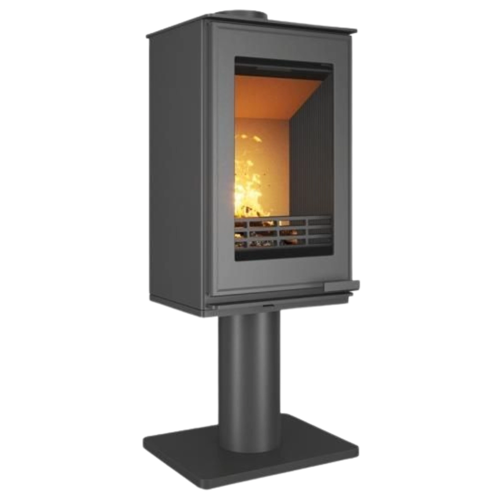 - Widok ognia przez trwałą szybę Robax® — odporną do 800 °C, co zapewnia estetykę i komfort użytkowania