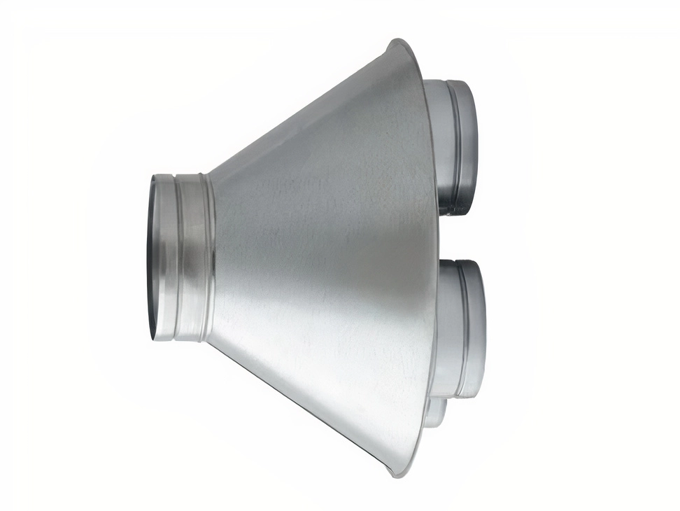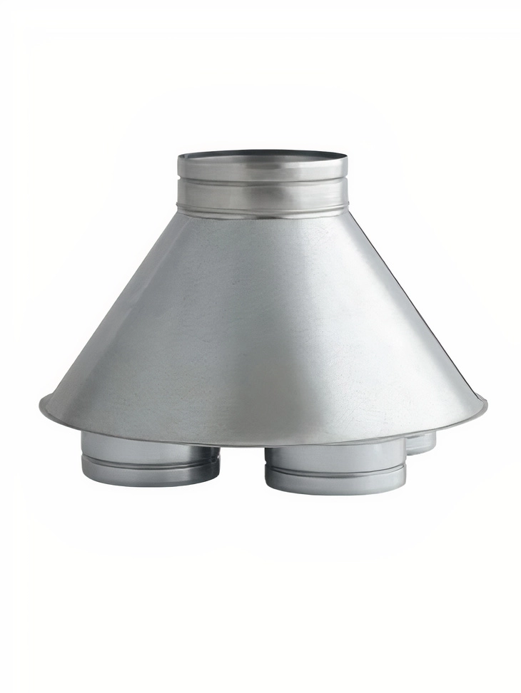 Skrzynka rozdzielcza z króćcami "Spiro" o średnicy wlotowej 125 mm i czterech wylotach o średnicy 100 mm. Skrzynka służy jako rozdzielacz strumienia ciepłego powietrza z głównego przewodu doprowadzającego na jego kolejne rozgałęzienia w instalacjach dystrybucji gorącego powietrza z kominka (DGP).
