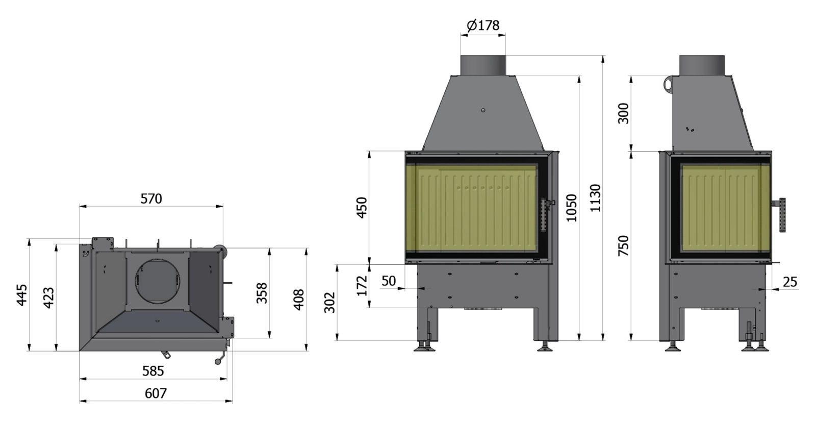 - Nóżki i śruby do pozycjonowania wkładu i wyrównywania nierówności podłoża i skrzynka z przyłączem do doprowadzenia powietrza zewnętrznego do spalania z zewnątrz budynku ułatwiają wygodę montażu.
