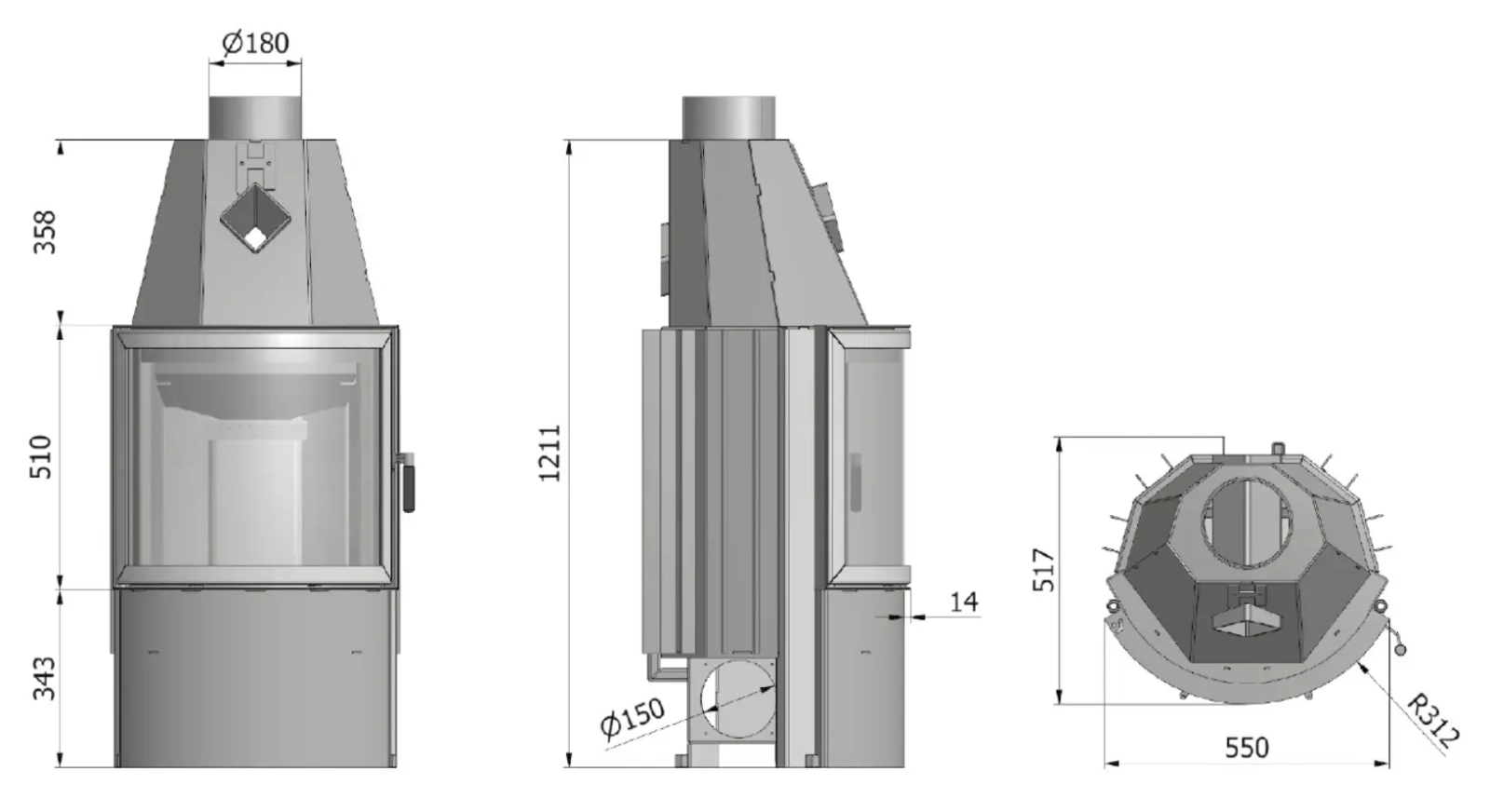 Klasa efektywności energetycznej -> A+ Moc nominalna -> 8,8 kW Zakres mocy grzewczej -> 4,5-11 kW Sprawność średnia -> 84% Średnica czopucha -> 180 mm Średnica dolotu powietrza -> 150 mm Maksymalna długość polan -> 300 mm Pole czynne wlot -> 440 cm² Pole czynne wylot -> 616 cm² Gwarancja -> 5 lat Masa -> 170 kg Rysunek wkładu Prisma MR z wymiarami: