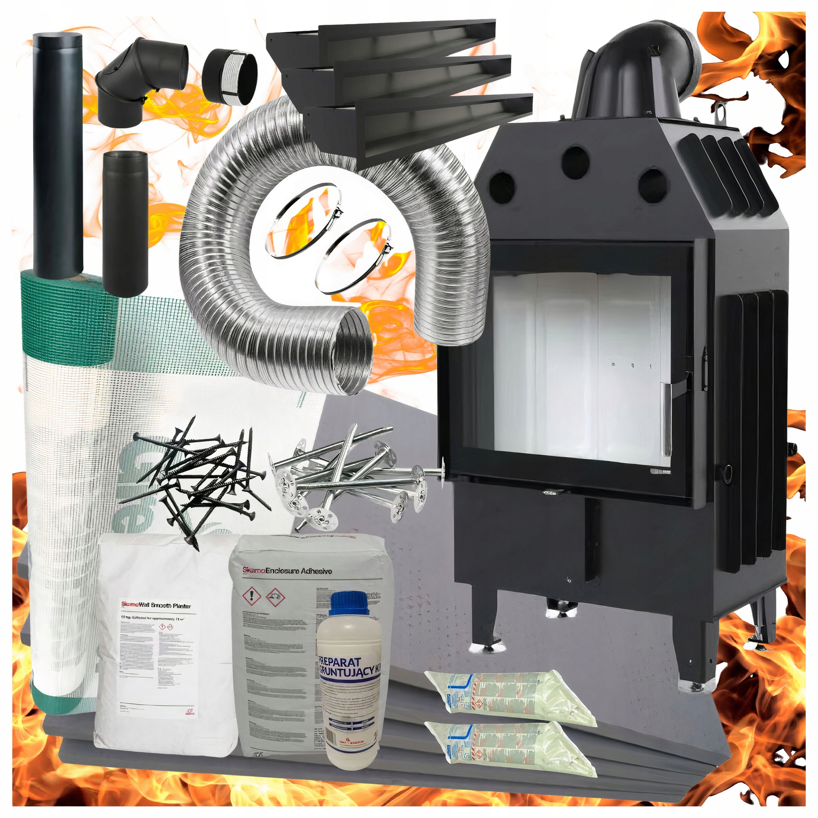 Zwróć uwagę, jak wiele zyskujesz, wybierając kompletny zestaw do zabudowy kominka. Nie musisz tracić czasu na dobór kompatybilnych elementów – wszystko otrzymujesz w jednym pakiecie, który został zaprojektowany z myślą o szybkim i profesjonalnym montażu. Konstrukcja oparta na stalowych profilach oraz panele osłonowe wykończone włóknem silikatowo-wapiennym dają ci solidne, bezpieczne i trwałe rozwiązanie. System jest przystosowany do dokładnej regulacji dzięki nóżkom, co znacznie ułatwia wypoziomowanie kominka w trudnych warunkach montażowych. Taka kompleksowość sprawia, że masz pełną kontrolę nad całym procesem zabudowy – od pierwszego kroku aż po końcowe wykończenie.