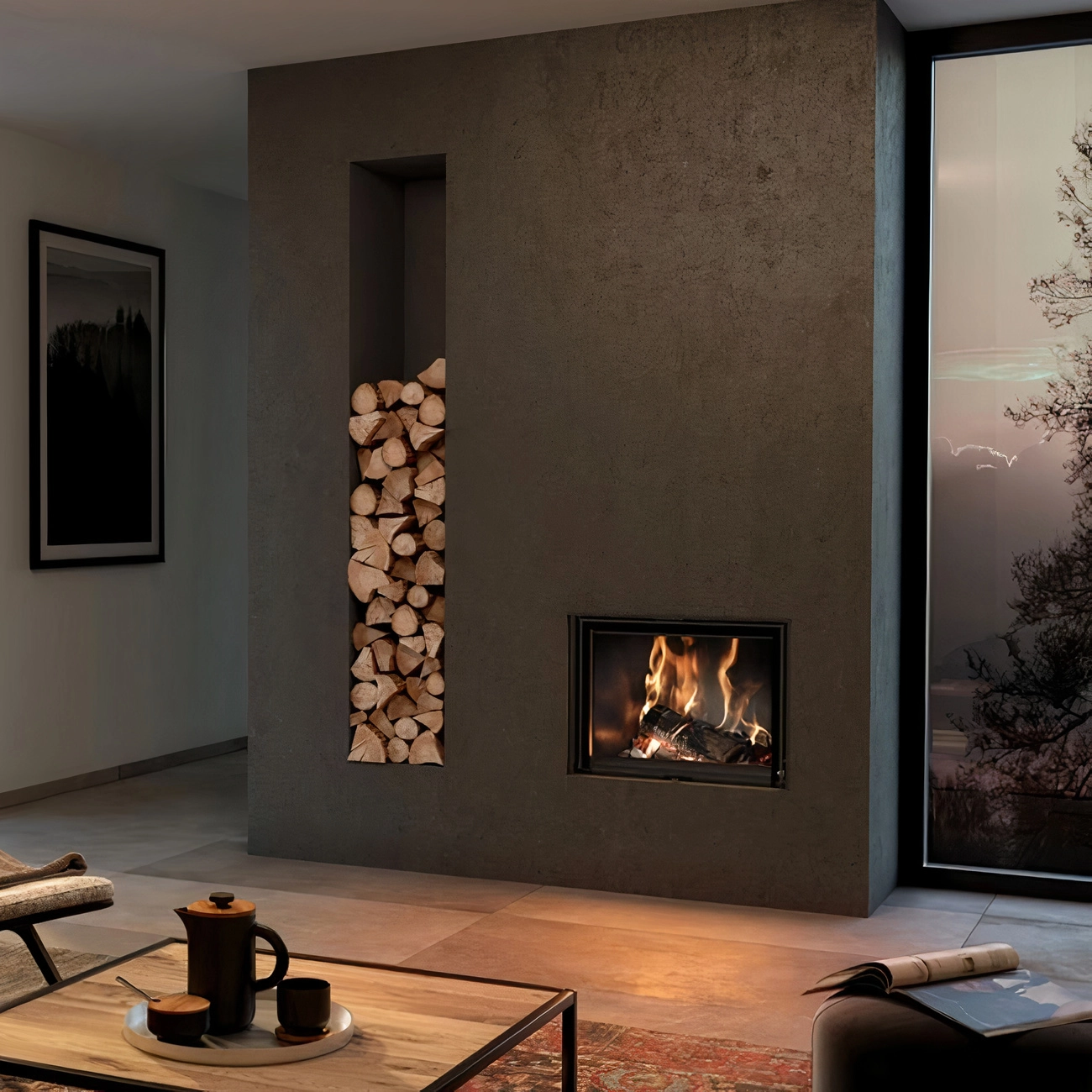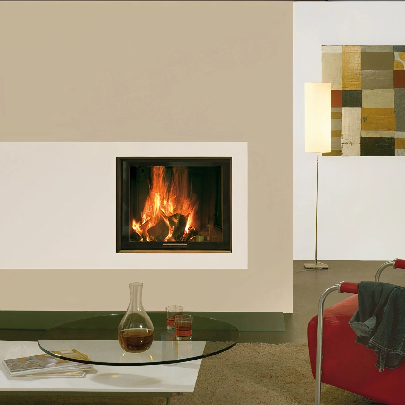 Unikalny system podnoszenia i otwierania drzwiczek oraz wyjątkowa bezramkowa konstrukcja montażu szyby zapewniają maksymalną widoczność ognia, bezpieczeństwo i komfort użytkowania. Dzięki opatentowanemu systemowi dociskającemu, wszystkie cztery krawędzie szyby są dociskane w końcowej fazie zamykania drzwiczek. Zastosowany w paleniskach szamot ma za zadanie podwyższyć temperaturę spalania oraz skumulować ciepło, aby oddawać je po wygaszeniu ognia.