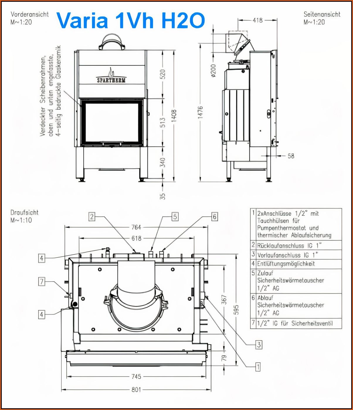 Wkład kominkowy Spartherm VARIA 1Vh H2O - rysunek z wymiarami